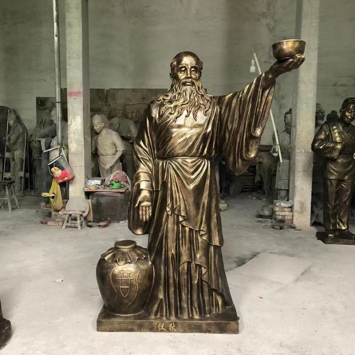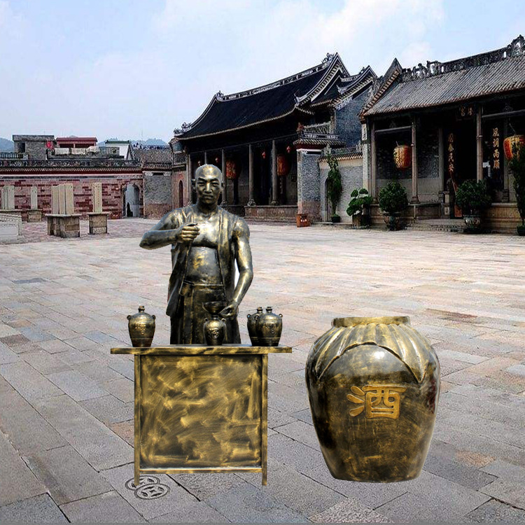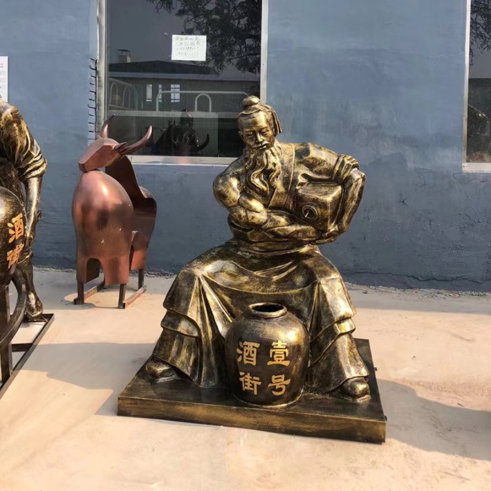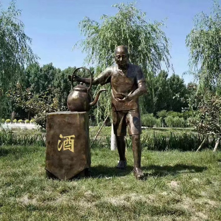 他的著裝也特色,一襲古樸的衣衫,褶皺處盡顯歲月的痕跡,仿佛記錄著他無數(shù)次忙碌的身影。腰間系著的布帶,隨意而又恰到好處地勾勒出他的身形,彰顯出一種質(zhì)樸而又自在的氣質(zhì)。手中那把酒壺,更是整個(gè)雕塑的點(diǎn)睛之筆。酒壺的造型古樸典雅,壺身的紋理清晰可見,仿佛能感受到那壺中美酒的芬芳正透過壺體緩緩散發(fā)出來。而從酒壺口流淌出的那一縷“酒水”,仿佛凝固在了時(shí)間之中,給人一種栩栩如生的感覺,讓人不禁想要湊近去聞一聞那醉人的酒香。