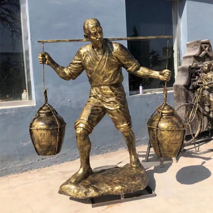 玻璃鋼賣酒人物雕塑所刻畫的賣酒人物形象,每一個(gè)細(xì)節(jié)都雕琢得入木三分。他的面容,洋溢著熱情與豪爽,那深邃的眼眸中,閃爍著真誠(chéng)與智慧的光芒,仿佛在向過往的行人訴說著自家美酒的香醇。微微上揚(yáng)的嘴角,帶著一抹笑意,讓人不禁聯(lián)想到他在售賣美酒時(shí)那爽朗的笑聲,仿佛能驅(qū)散人們心頭的陰霾。