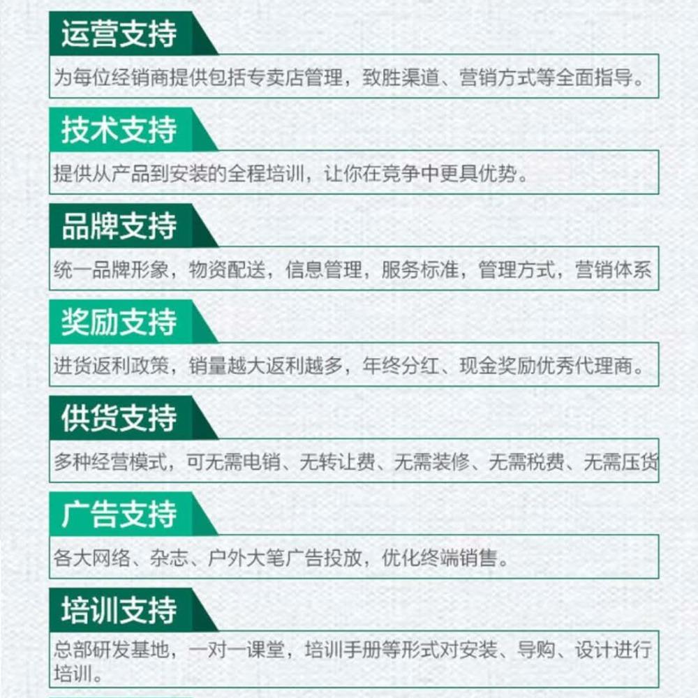 6、公司支持:公司免費(fèi)提供 體驗(yàn)區(qū)、接待區(qū)地面鋪裝用的地暖產(chǎn)品。免費(fèi)提供電熱瓷磚展示臺(tái)一套,全模塊地暖展示臺(tái)一套。公司企業(yè)網(wǎng)站、企業(yè)公眾號(hào)、廣告開頭的宣傳視頻等都會(huì)添加代理合作商的頁(yè)面介紹和視頻展示。(產(chǎn)品在百度、360、搜狗等網(wǎng)站也有推廣)。