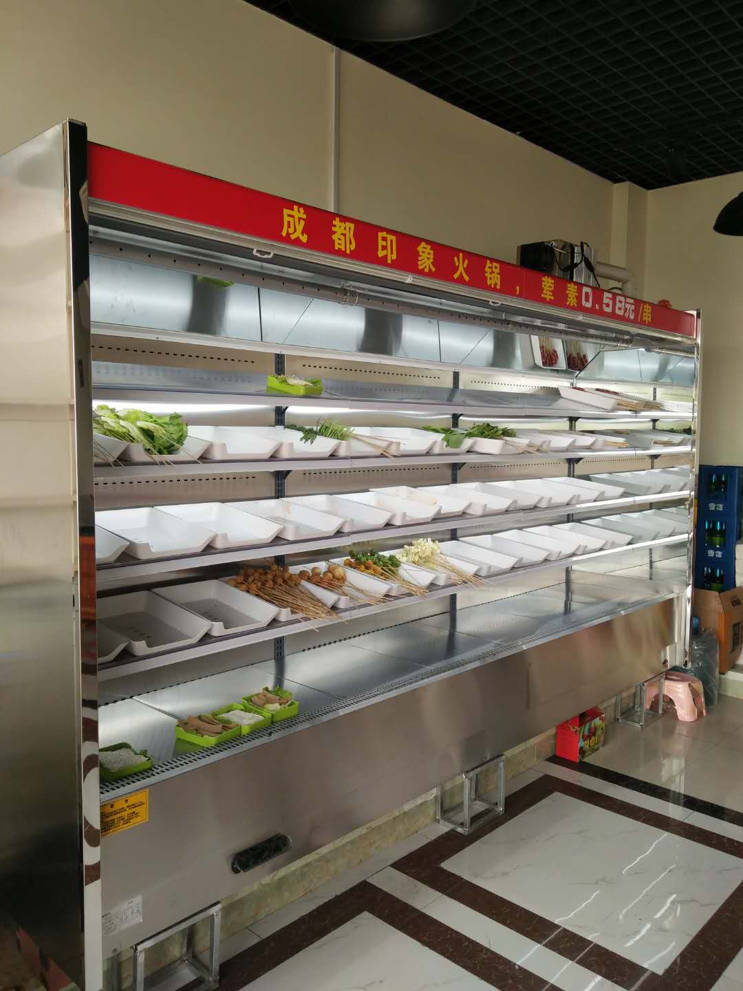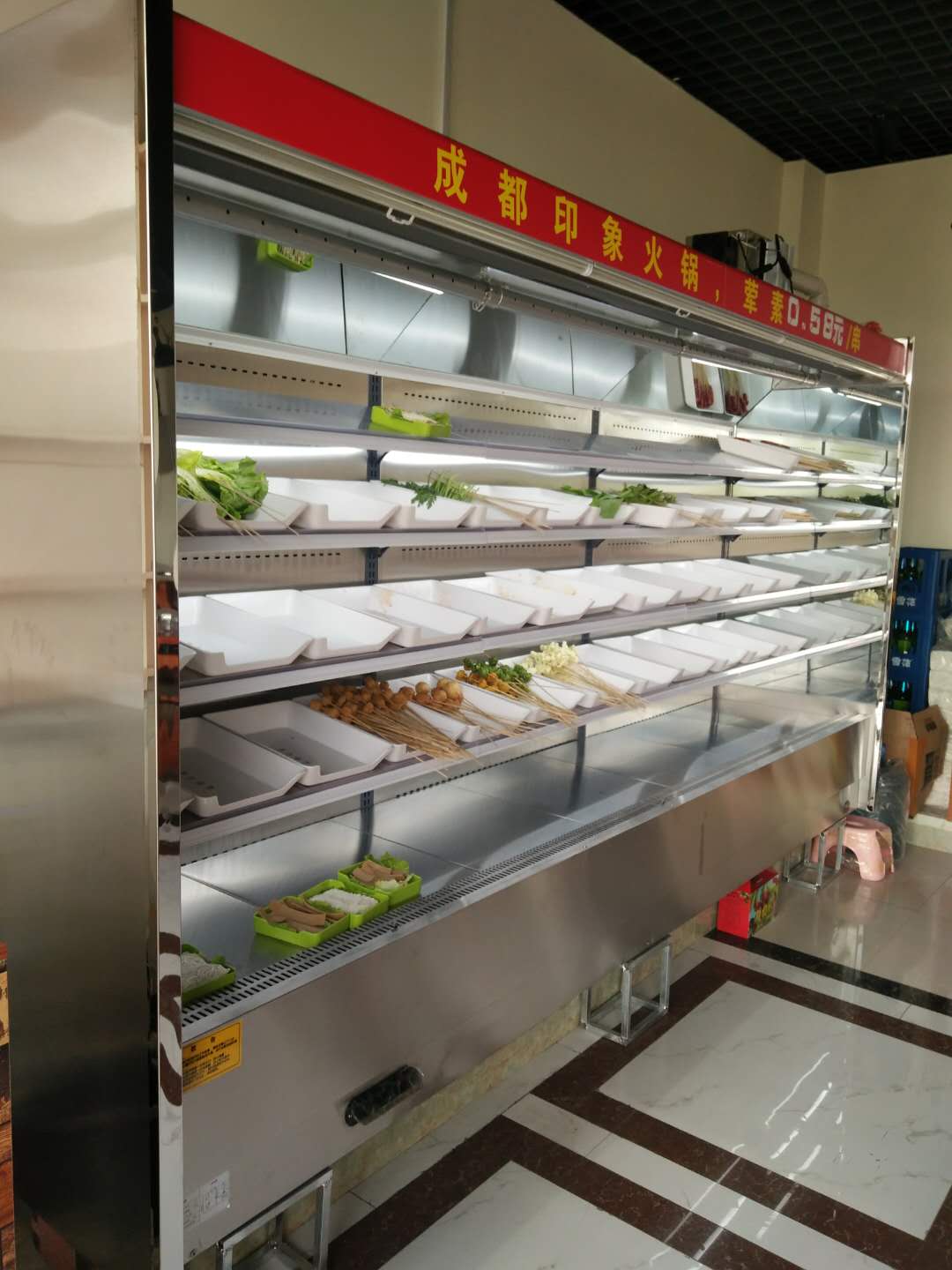 11、明檔菜品自選柜使用進(jìn)口整套靜音減震機(jī)組,運(yùn)行聲音更小,效率更高,制冷速度更快,使用壽命更加長久。