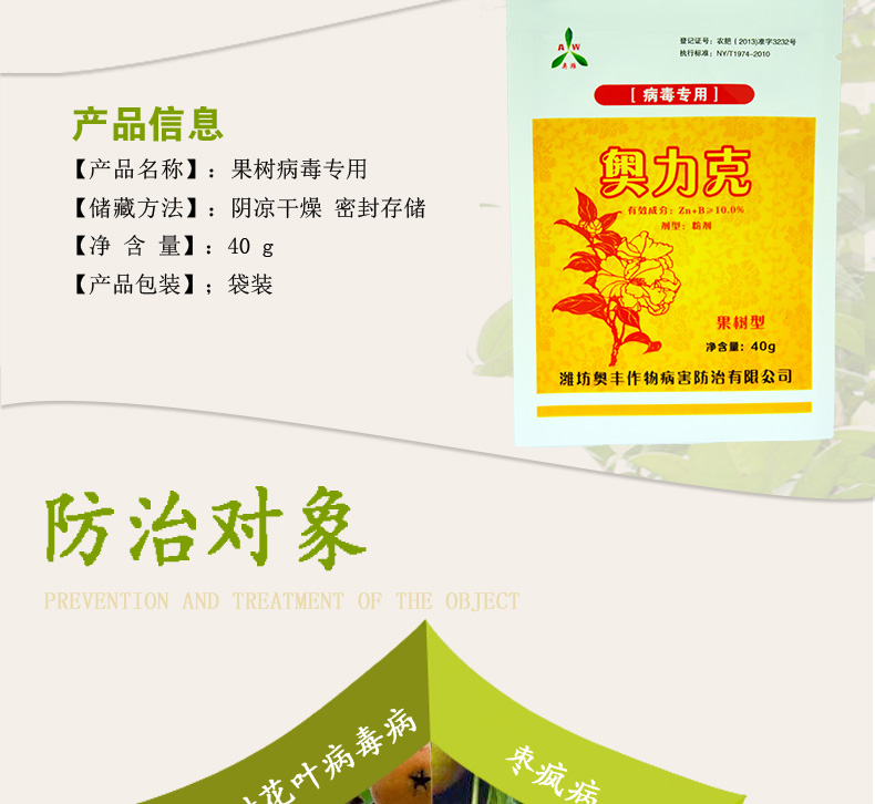 在萌芽前、花露紅期、謝花2/3時、形成來年所有花芽和葉芽的關(guān)鍵時期這四個時期分別用《奧力克--果樹病毒》40g兌水30斤對病株及病株周圍的果樹灌根或噴霧。