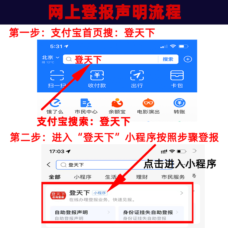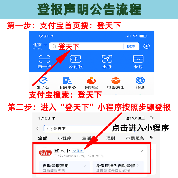 登報聲明常見的有線上和線下兩種選擇,線下辦理登報適合時間充裕的人員,但是隨著互聯(lián)網(wǎng)的普及,線下的登報點(diǎn)越來越少了,線下辦理業(yè)務(wù)的時間會等待久一點(diǎn),或者可能因?yàn)闆]帶齊相關(guān)的資料,需要跑二次才能辦理成功,費(fèi)時費(fèi)力。而線上辦理不受時間、地方、天氣、節(jié)假日等的影響,均可正常提交登報信息進(jìn)行辦理,操作得當(dāng)?shù)脑?,一般幾分鐘就可以搞定,辦理過程中有問題也可以及時的進(jìn)行修改。線上辦理登報聲明以“登天下”為例,流程如下: 1.支付寶頁搜索:登天下。 2.進(jìn)入【登天下】小程序后選擇登報的城市 3.選擇需要刊登聲明的報刊。 4.按照格式編輯登報內(nèi)容后提交刊登。 5.見報后,郵寄報紙