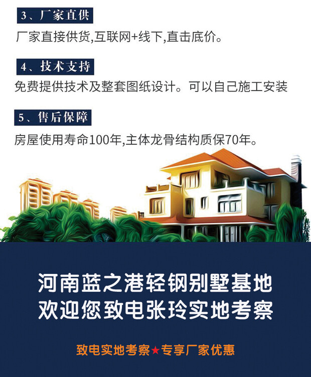 藍之港輕鋼別墅生產(chǎn)制造廠家,可自建:設計+建房+裝修,可經(jīng)銷:生產(chǎn)+配送+施工+推廣+售后整套扶持。河南藍之港所有材料都是一站式供貨,價格透明,優(yōu)惠力度大,聯(lián)手藍之港,合作更放心,也更省心,歡迎您致電藍之港總部小編張玲實地考察參觀,專享建房優(yōu)惠。