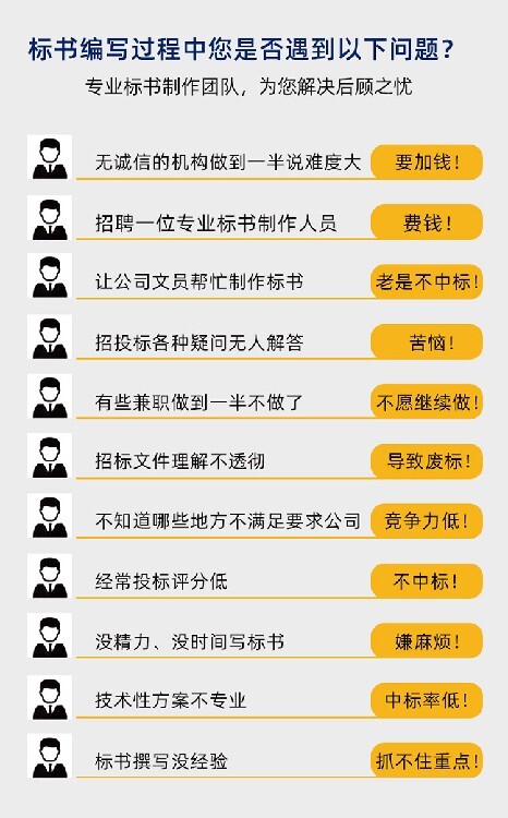 針對(duì)標(biāo)書(shū)編寫(xiě)這塊采用團(tuán)隊(duì)式合作編寫(xiě),從前期資料的搜集,各個(gè)模塊內(nèi)容的編寫(xiě),到整個(gè)標(biāo)書(shū)編寫(xiě)完。有規(guī)范化的流程,后期還有老師為您稿件校稿,您的標(biāo)書(shū)質(zhì)量問(wèn)題。
