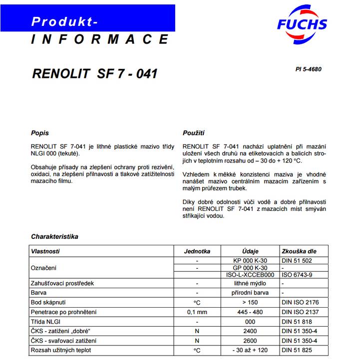 RENOLIT SF 7-041是NLGI等級000鋰基脂(油脂)它含有添加劑IM